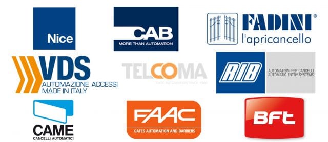 Aprimatic, Arco Industrie, Balconi, BFT, Came, Ciesse Service, Dea, Dieffematic, Ditec, Ducati, Dweb, Easy Gate, EB Technology, Elvox, Extel, Faac, Fadini, Genius, Gibidi, Gilgen, Hörmann, Kopron, Life, Lince, Nice, Olmi, O&O, Quiko, Quasar, Rib, Roger, Serai, Sea, Somfy, Tau, Telcoma, VDS, V2.